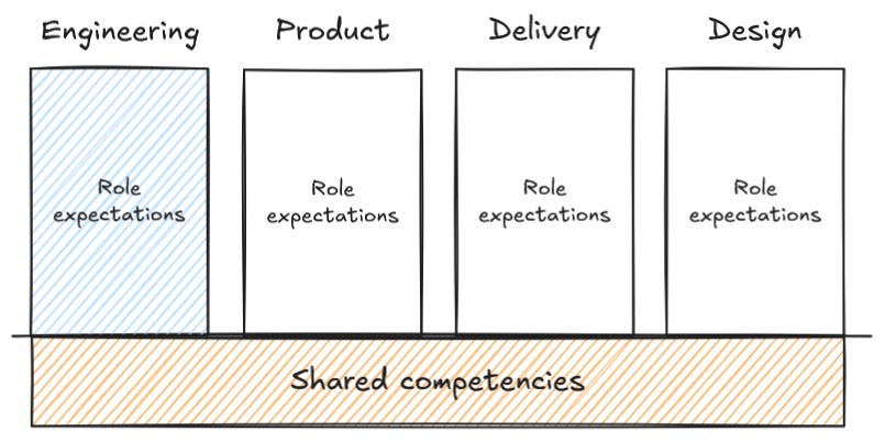 An engineering leader cannot define the specific expectations for product or delivery managers. However, having shared core competencies aligns the entire triad to a common baseline, reducing friction even if other functions have not yet defined their own frameworks.