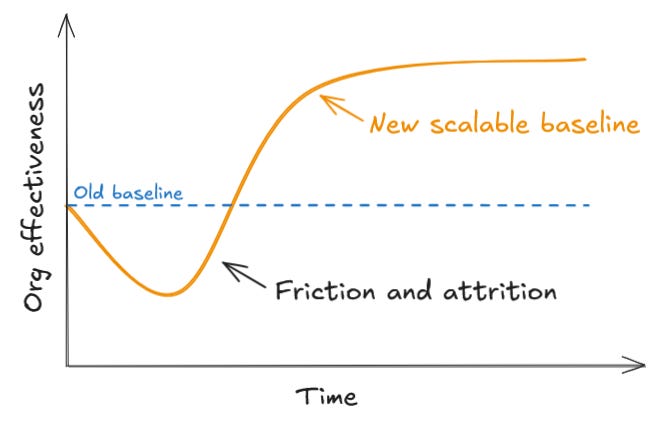 However, this transition requires deliberate investment: senior leadership reduces this friction by coaching managers on how to apply the framework, temporarily redirecting their energy to work effectively with the new standard.