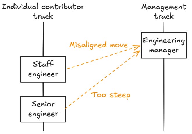 Upgrading the management framework also exposes cracks in other tracks. If the individual contributor track lags behind, there is an imbalance. The progression from senior engineer to engineering manager becomes too wide or unclear, and the supposedly lateral move from staff engineer to engineering manager turns into a difficult diagonal move.